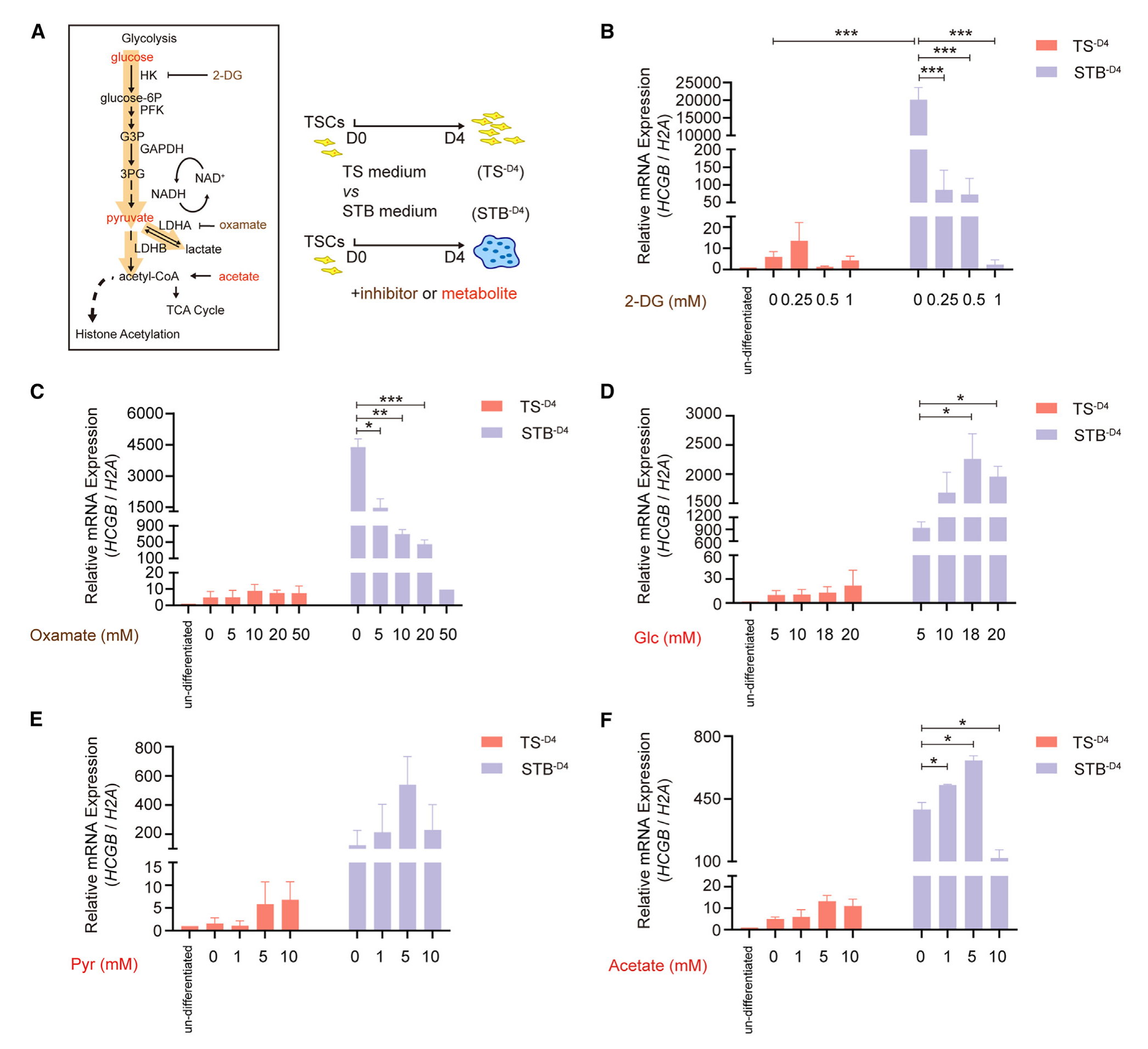 接下來(lái),該研究使用糖酵解的關(guān)鍵代謝物,包括葡萄糖、丙酮酸和醋酸酯(用于補(bǔ)充細(xì)胞內(nèi)乙酰輔酶A),來(lái)探索糖酵解代謝物對(duì)人滋養(yǎng)細(xì)胞合胞的影響。結(jié)果表明,隨著葡萄糖濃度的增加,從5到18 mM,STB-D4細(xì)胞中HCGB以及SDC1、ERVFRD1、ERVW1、GCM1、PSG4和CYP19A1的表達(dá)逐漸增強(qiáng),滋養(yǎng)細(xì)胞的合胞化程度逐漸增強(qiáng)(圖3D)。丙酮酸處理在未分化的hTSCs和正在合胞的hTSCs中導(dǎo)致了類(lèi)似的反應(yīng),即一定濃度范圍內(nèi)(10 mM)的代謝物增加了滋養(yǎng)細(xì)胞的合胞 (圖3E)。同樣,在一定濃度范圍內(nèi),乙酸也顯著促進(jìn)滋養(yǎng)細(xì)胞合胞(圖3F),在超高濃度下,HCGB、GCM1、PSG4和CYP19A1被顯著抑制(圖3)。特別指出,糖酵解藥物和中間體對(duì)HTSCs和STBs的合胞有特異性作用,但對(duì)未分化的htsc沒(méi)有特異性作用。因此,涉及STB特異性信號(hào)傳導(dǎo),并且調(diào)節(jié)滋養(yǎng)層合胞化可能需要較佳水平的基礎(chǔ)糖酵解物質(zhì)。