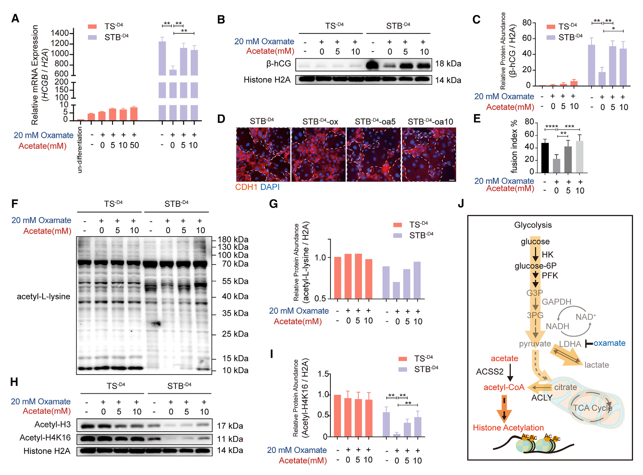 實(shí)驗(yàn)表明,糖酵解產(chǎn)物顯著抑制hTSCs的合胞,而最佳水平的乙酸促進(jìn)hTSCs的合胞。為了反向確定最關(guān)鍵的糖酵解代謝物,該研究探索了最下游的糖酵解代謝物乙酰輔酶A(由乙酸補(bǔ)充)是否可以挽救糖酵解抑制對(duì)合胞的影響。結(jié)果顯示,在糖酵解抑制的情況下,乙酸能顯著恢復(fù)STB-D4中HCGB和SDC1的表達(dá)水平(圖4A-4C)。融合指數(shù)結(jié)果證實(shí)了合胞恢復(fù)以劑量依賴(lài)的方式(圖4D和4E)。然而,當(dāng)乙酸濃度過(guò)度增加到50 mM時(shí),STBs細(xì)胞形態(tài)發(fā)生異常,引發(fā)細(xì)胞死亡,HCGB和SDC1基因表達(dá)無(wú)法檢測(cè)(圖4A)。因此使用10mM醋酸鹽用于所有其他實(shí)驗(yàn)。實(shí)驗(yàn)顯示,低濃度20 mM的草酸鹽對(duì)活死染色、線粒體膜電位、總蛋白、ADP/ATP比率和NAD+/NADH比率的影響不顯著或輕微,但通過(guò)靶向LC-MS/MS檢測(cè),乙酰輔酶A顯著降低。10 mM醋酸鹽可使其乙酰輔酶A水平恢復(fù)正常。這些結(jié)果表明,乙酰輔酶A可能對(duì)滋養(yǎng)細(xì)胞的合胞作用很重要。