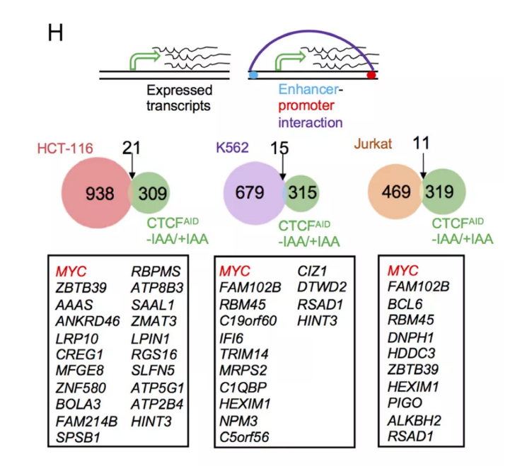 CTCF基因啟動子的染色質可及性在CTCF耗竭時也有所增加(圖3D),這一點通過定量PCR (Q-PCR)進一步得到驗證(圖3E)。這些數(shù)據(jù)表明CTCF可以抑制自身以保持最*表達水平。對于CTCF耗竭后被下調(diào)的基因,如MYC,并沒有在啟動子區(qū)域檢測到有統(tǒng)計學意義的染色質可及性變化。因此,當啟動子區(qū)域保持開放時,遠端增強子區(qū)域的染色質景觀變得更難以接近,再加上CTCF耗竭,可能在控制能調(diào)控MYC轉錄的遠端增強子-啟動子loop環(huán)的形成中發(fā)揮作用。