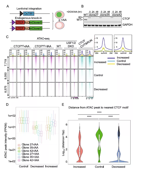 前期研究已經(jīng)通過將雙等位基因miniAID-mClover3標簽導入人的內(nèi)源性CTCF位點,并產(chǎn)生了三個CTCFAID細胞的克隆。在強力霉素和生長素(IAA)處理下,強制表達與Skp1/Culin/F-box (SCF)泛素連接酶組分連接的OsTIR1,快速降解CTCF融合蛋白(圖1A)。當強力霉素和IAA完全從培養(yǎng)基中洗脫后,這種降解是可逆的。通過對三個單細胞來源的克隆進行IAA處理24小時的免疫印跡實驗,證實了CTCF能夠有效降解(圖1B),類似于之前在48h處理條件下的研究結果。