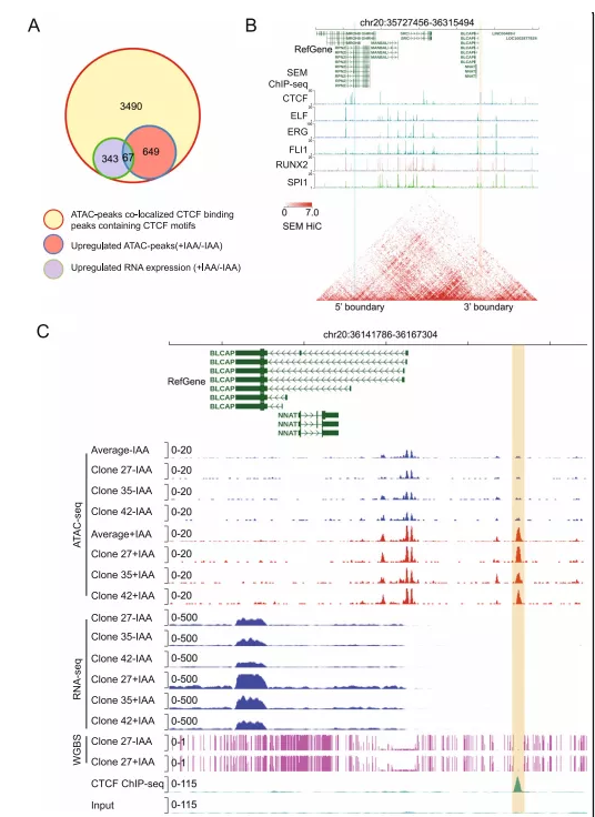 本文通過綜合分析建立了一個框架來識別假定的CTCF介導的絕緣子元件。將ATAC-seq結果中的3490個峰和有CTCF結合的峰取交集,共有716個增強的ATAC-seq峰。接下來,將它們與RNA-seq結果中上調(diào)的基因進行比對,判斷TSSs是否位于距離DARs區(qū)域2-50 kb的范圍。綜上所述,有67個基因符合這些標準(圖(Fig 4A)。這67個基因中有20個基因的附近有染色質loop環(huán)。例如,在BLCAP基因上游約7 kb處觀察到一個假定的抑制性CTCF結合峰,該峰位于Hi-C數(shù)據(jù)所示的染色質絕緣loop環(huán)中(圖4B )。在未經(jīng)過IAA處理的對照CTCFAID細胞中,CTCF與該motif結合導致染色質可及性受到抑制,這在ATAC-seq數(shù)據(jù)中信號的缺失很明顯。然而,在急性CTCF耗竭時,ATAC-seq峰值信號和BLCAP mRNA表達明顯增加(圖4C)。