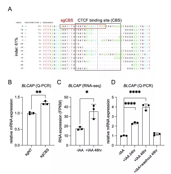 為了進一步驗證預測的假定絕緣子的作用,將慢病毒表達的引導RNA感染表達Cas9的SEM細胞中,然后進行抗生素選擇。Sanger基因組測序(Inference of CRISPR edit, ICE)在目標人群中檢測到約61%的總indel頻率(圖5A),與非靶向導向對照組(sgNT)相比,導致BLCAP mRNA表達顯著增加(圖5B)。用IAA處理CTCFAID細胞24和48小時,然后洗脫IAA進行CTCF修復。通過RNA-seq分析和Q-PCR驗證,驗證急性CTCF蛋白耗竭時BLCAP mRNA的表達(圖5C)。不出所料,生長素處理24或48 h后CTCF蛋白急性耗竭,BLCAP表達水平顯著升高。更重要的是,洗脫生長素后,其表達水平恢復到親本細胞的水平(圖5D)。綜上所述,這些數(shù)據(jù)有力地支持了CTCF在BLCAP調(diào)控區(qū)域的占用充當了控制BLCAP表達的功能絕緣體。