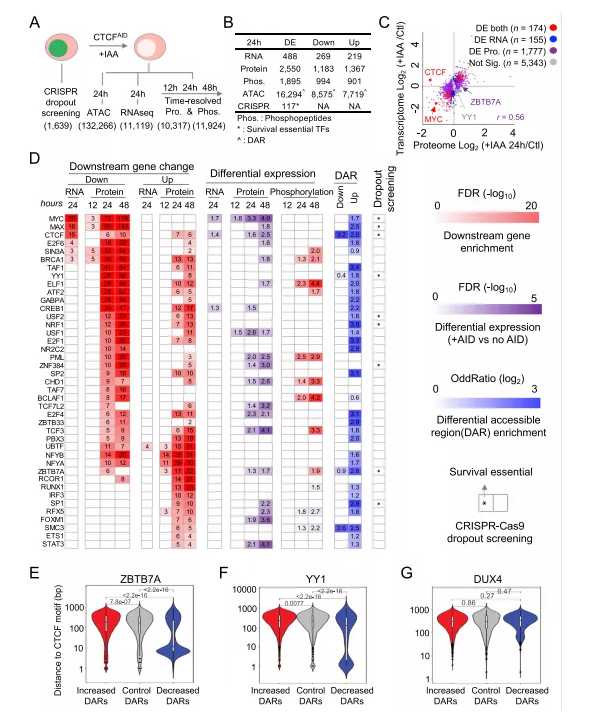 本文開發(fā)了一種多組學聯(lián)合的方法來定義CTCF共調(diào)控轉錄因子,總共鑒定了40個CTCF共同調(diào)控因子,這些TF在急性CTCF耗竭時在mRNA和/或蛋白質水平上顯著影響其下游靶基因的表達(圖6D)。正如預期的那樣,這40個CTCF共調(diào)控因子中的大多數(shù)也在CTCF介導的DARs中有共同定位,證實了它們與CTCF有著潛在的直接共同調(diào)控作用。