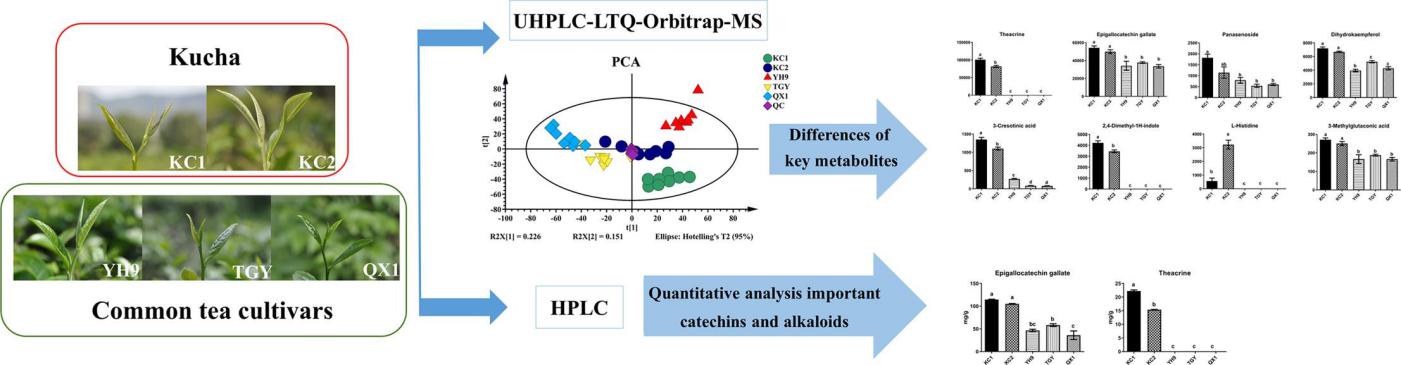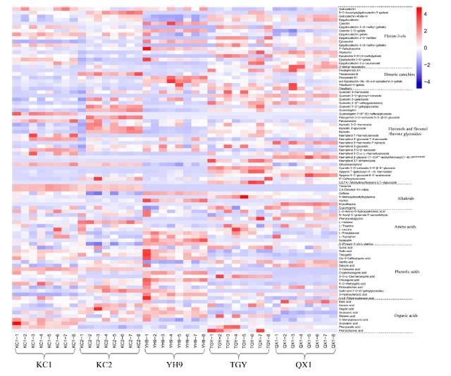 研究結果:采用非靶向代謝組學方法,研究了苦茶的代謝物。結果表明,2個苦茶品種與3個對照普通茶品種之間共鑒定出90種差異代謝物。其中,茶苦堿等8種代謝物在KC1和KC2中的含量均顯著高于對照品種。這些化合物中的大多數(shù)都是導致苦茶苦味的重要因素?;诟咝б合嗌V的定量分析結果與LC-MS分析結果相似,表明苦茶中茶苦堿和EGCG含量高于對照品種。此外,研究數(shù)據(jù)還表明,苦茶的強烈苦味可能是兒茶素、生物堿、黃酮醇和黃酮醇/黃酮苷、氨基酸和酚酸的綜合作用的結果。為進一步研究苦茶的苦味和營養(yǎng)特性提供了理論依據(jù)。