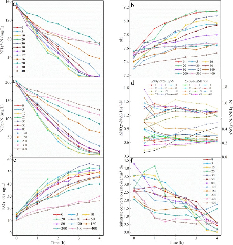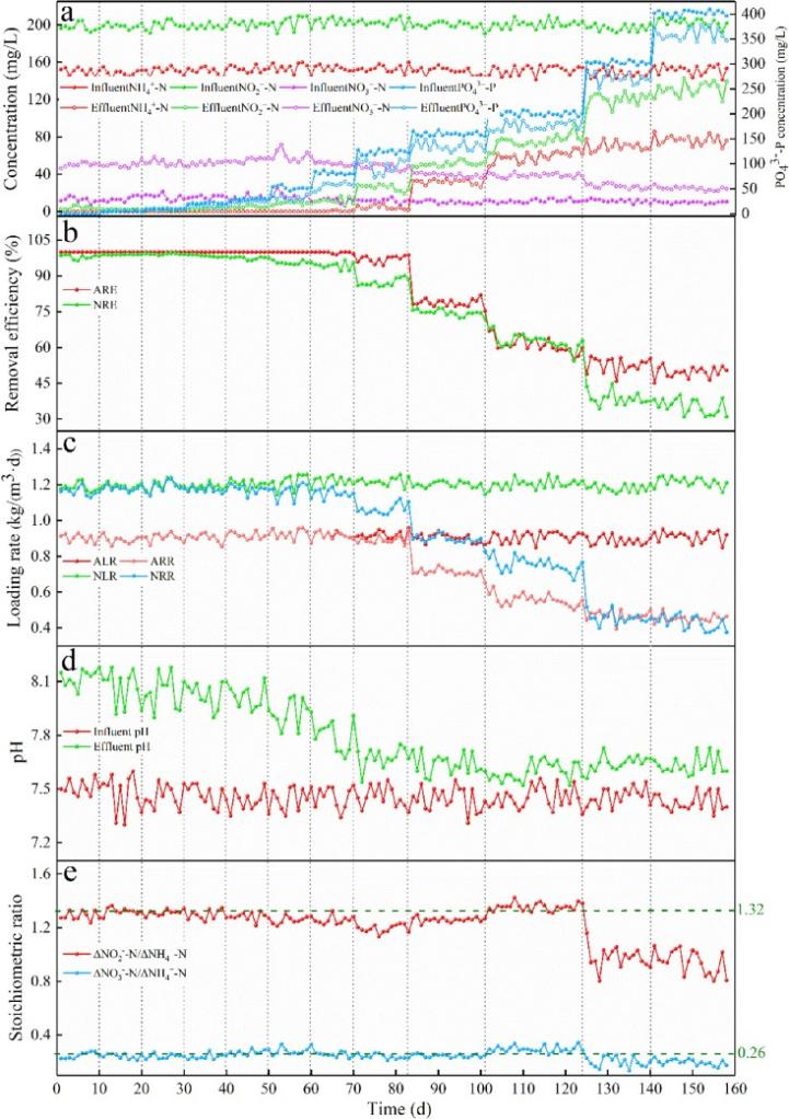 在本研究中,當磷酸鹽濃度超過160 mg/L時,氮和磷酸鹽的物質平衡被打破,隨著KH2PO4用量的進一步增加,進水pH值顯著下降。為了使進水pH值保持在7.5,加入氫氧化鈉進行酸堿中和。隨著氫氧化鈉的注入,在液相中觀察到白色絮狀沉淀。此外,隨著磷酸鹽用量的增加,所需的氫氧化鈉濃度也增加,產(chǎn)生更多的白色絮狀沉淀物,這些白色沉積物會粘附在生物膜上并延遲底物滲透到內(nèi)部生物質中,正是由于這些非織造膜載體的存在,MAB可以富集成致密致密的生物膜,而不是漂浮和松散的顆粒。因此,MAB的新細胞不能以被沉淀覆蓋的顆粒為核,形成更大的顆粒。