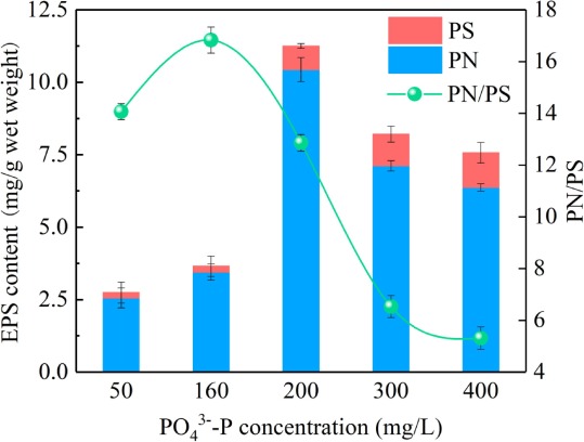 EPS是一種由微生物分泌的高分子聚合物,可以保護細菌免受外界有毒物質的侵害。一般可分為可溶性EPS(SEPS)、松散結合型EPS(LB-EPS)和緊密結合型EPS(TB-EPS),它們的主要成分是蛋白質(PN)、多糖(PS)和腐殖質。在160 mg/L PO43–P 時,EPS的產(chǎn)量最初從2.74增加到3.66 mg/g 濕重。當磷酸鹽濃度超過200 mg/L 時,EPS 的產(chǎn)量急劇增加至11.25,然后降至7.57 mg/g 濕重(圖6)??傮w而言,與不添加磷酸鹽相比,高磷酸鹽濃度下EPS的產(chǎn)量增加,這可能與沉淀的形成有關。惡劣的生活環(huán)境迫使微生物產(chǎn)生更多的EPS來保護自己免受損害,此外,PN/PS比值在160 mg/LPO43–P時達到最大值16.83,然后隨著磷酸鹽濃度的增加而降低,這意味著微生物細胞的疏水性降低了。EPS產(chǎn)量的下降可歸因于 MAB在有害情況下對細胞內(nèi)物質的消耗。即由于MAB生物膜被磷酸鈣鎂沉淀覆蓋,內(nèi)部底物稀少,為了維持生理活動,微生物可以降解EPS以獲得能量。而EPS產(chǎn)量的下降不利于MAB抵抗磷的干擾,MAB的活性也有所下降。