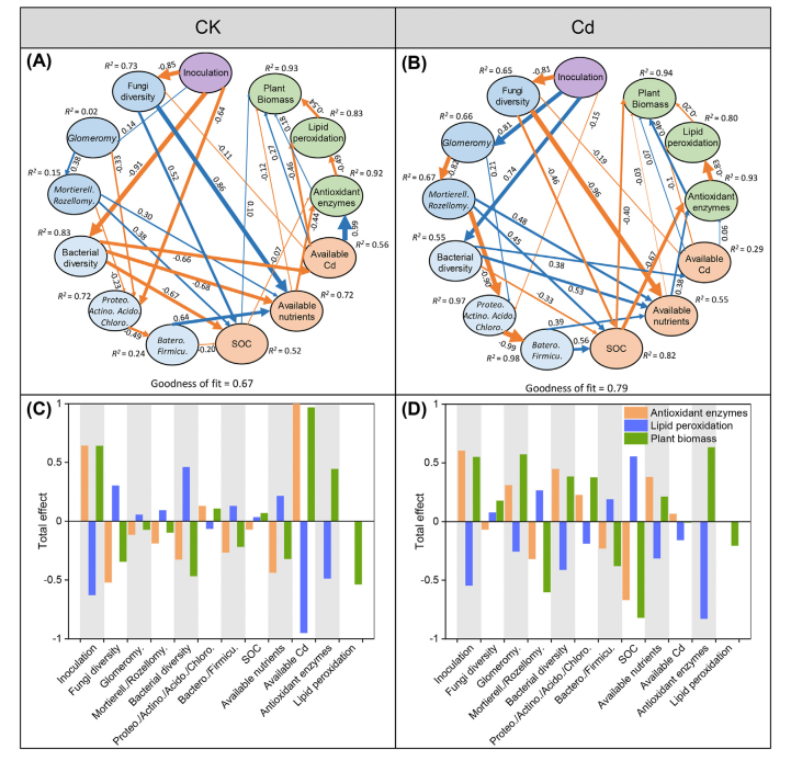 與細菌群落相反,VPA顯示真菌群落對土壤變量的影響較小(圖4A和B),這與我們的結果一致,即除Olsen-P和pH值外,真菌群落與根際中的SOC和養(yǎng)分沒有很強的相關性(圖4C)。我們的結果表明,真菌群落在提高紫花苜??笴d脅迫方面的相關效果低于細菌群落。這些結果也被發(fā)現(xiàn)的關鍵真菌類群和根際變量之間的微弱相關性所支持(圖4E)。但是,由AMF接種引起的這些關鍵真菌類群的變化強烈影響了關鍵細菌類群,這表明這些關鍵真菌類群可能通過影響細菌群落的方式在Cd脅迫下輔助苜蓿生長中發(fā)揮間接作用。這些結果也闡明了根瘤菌和AMF共同接種與單獨接種相比促進苜??剐院蜕L的原因。通過PLS-PM分析(圖5),關鍵的真菌類群對關鍵的細菌類群有直接影響,這對植物的抗性和生長有間接的有利影響。一般來說,在根瘤菌和AMF共同接種處理下,根瘤菌群落而非相應的真菌群落主要提高了紫花苜蓿對Cd脅迫的抗性。