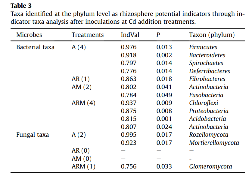 我們的研究在所有不同的處理中檢測到了10個真菌門類(相對豐度>1%),即子囊菌門(Ascomycota)、Unclassified、擔子菌門(Basidiomycota)、球囊菌門(Glomeromycota)、被孢霉門(Mortierellomycota)、壺菌門(Chytridiomycota)、毛霉門(Mucoromycota)、尾蟲門(Cercozoa)、油壺菌門(Olpidiomycota)和羅茲菌門(Rozellomycota) (圖2B)。在所有處理中,占主導地位的真菌門為Ascomycota(44.3-65.7%)和Unclassified(14.9-36.6%)。Cd的添加顯著影響了Cercozoa和Rozellomycota的相對豐度,接種后極大地影響了Glomeromycota、Mortierellomycota和Rozellomycota的相對豐度(P <0.05)。其他菌類在真菌群落組成中只占很小的一部分,如Basidiomycota和Glomeromycota。同時,對指示菌種的分析表明,從門到科水平的這些細菌類群(Proteobacteria、Actinobacteria、Acidobacteria、Chloroflexi、Bacteroidetes和Firmicutes)和真菌類群(Glomeromycota、Mortierellomycota和Rozellomycota)都是根瘤菌和AMF共同接種后根際微生物群落的主要指標(表3)。