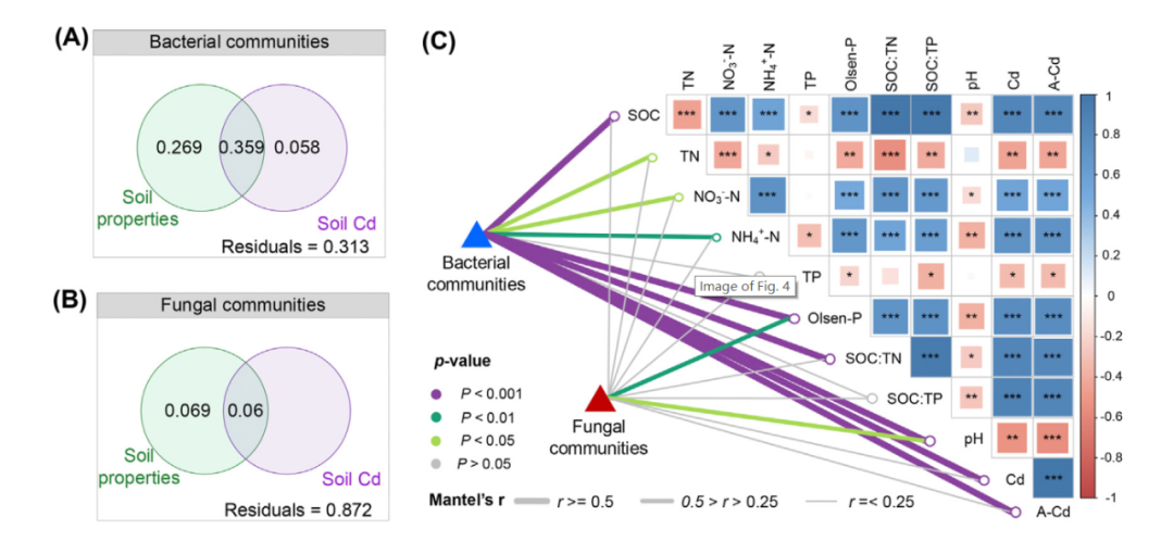 Pearson相關分析發(fā)現(xiàn),Cd、OTU和細菌群落的α多樣性指數(shù)(即Shannon、Simpson、Chao1和ACE)之間存在顯著的相關性(P<0.05)。除Shannon指數(shù)外,SOC、TN、SOC:TN和SOC:TP與OUT以及細菌群落中的這些α多樣性指數(shù)之間存在顯著的相關性。但是,除了真菌群落的OTU和Shannon與SOC和SOC:TN外,真菌群落的α多樣性指數(shù)與這些土壤性質之間沒有發(fā)現(xiàn)明顯的相關性。