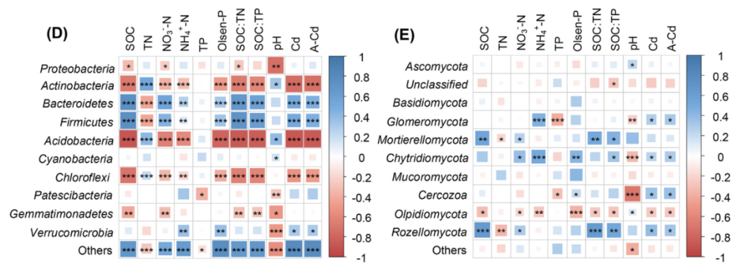 VPA的結果表明,土壤性質和Cd含量一般能解釋細菌群落的大部分變化(62.8%),而它們只能解釋真菌群落12.9%的變化(圖4A和B)。Mantel檢驗和相關分析表明,除TP和SOC:TP外,其他土壤變量均與細菌群落顯著相關,而只有Olsen-P和pH值對真菌群落有顯著影響(圖4C)。此外,RDA還證實,與不同處理的真菌群落相比,土壤變量對不同處理的細菌群落有更明顯的影響。根據(jù)相關性熱圖和RDA或CCA,細菌群落中的Actinobacteria、Bacteroidetes、Firmicutes、Acidobacteria和Chloroflexi與除TP外的其他土壤變量顯著相關(P<0.05;圖4D)。然而,在真菌群落中,只有Chytridiomycota、Olpidiomycota和Rozellomycota與大多數(shù)土壤變量表現(xiàn)出明顯的相關性(P <0.05;圖4E)。