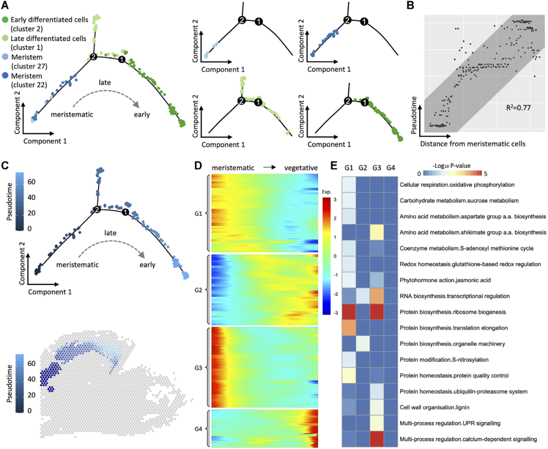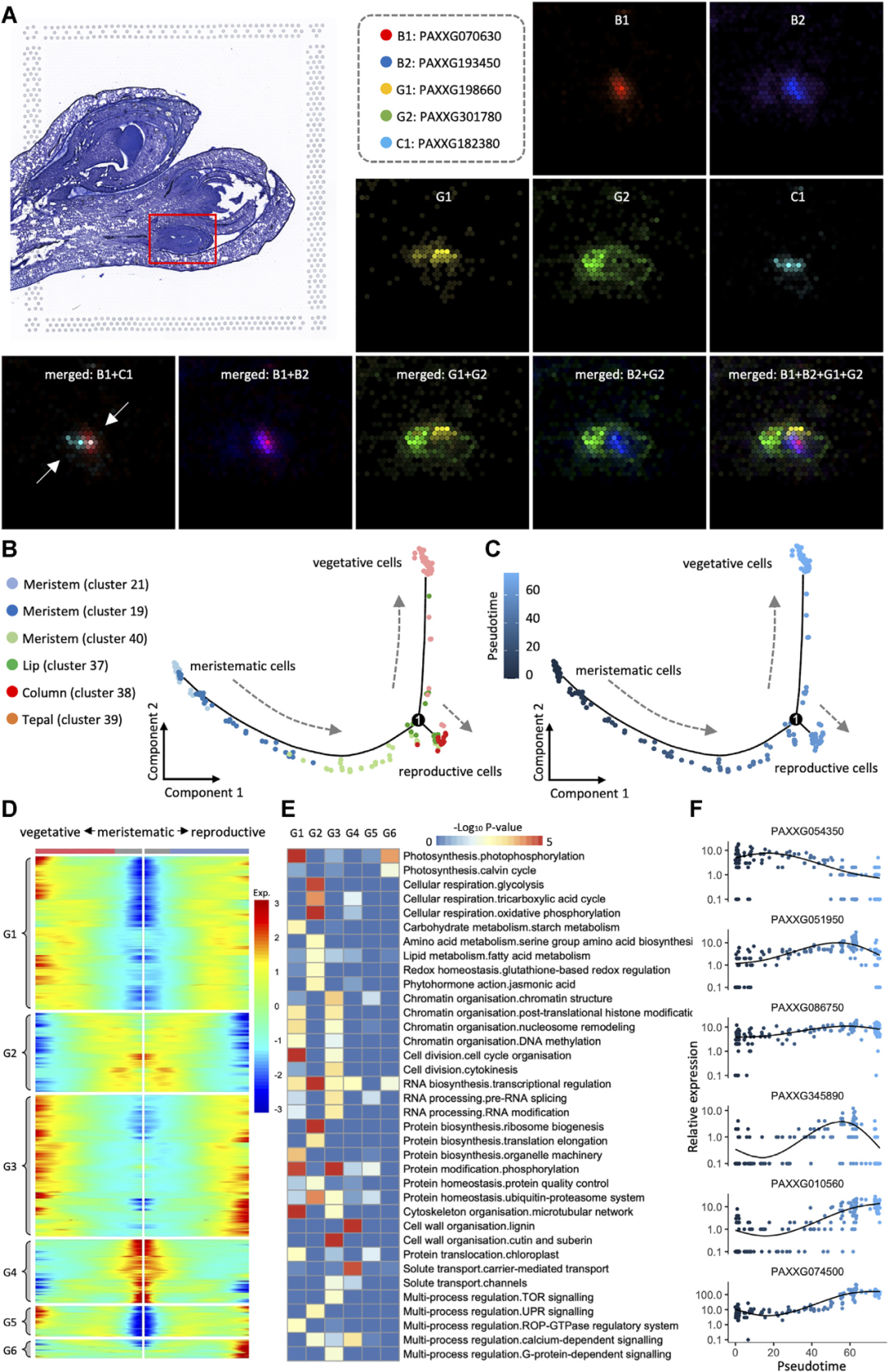 為了研究從分生組織細胞到營養(yǎng)型細胞(花被、唇瓣)和生殖細胞(花柱)的分化,研究團隊用Monocle繪制了細胞狀態(tài)的軌跡。如圖2B所示,三簇分生組織細胞形成了一條連續(xù)的路徑,代表其發(fā)育過程,與其在組織學切片上的位置高度一致。該路徑分為兩條子路徑:一條是由花被片中的營養(yǎng)型細胞組成,另一條由花柱中的花藥原基生殖細胞組成。細胞類型變化的軌跡作為動態(tài)發(fā)育過程的靜態(tài)投影,也可以理解為分生組織細胞的擬時序分化。如圖2C所示,此時營養(yǎng)型細胞出現(xiàn)較早,并分散在子路徑的遠端。共鑒定出4,685個空間差異基因與發(fā)育擬時間相關,對這些基因繪制分支軌跡基因表達熱圖,發(fā)現(xiàn)它們隨著發(fā)育路徑的分離表現(xiàn)出不同的表達模式(圖2D)。MapMan功能富集圖顯示它們主要富集在細胞壁代謝、激素、脂質、蛋白質和RNA合成等功能上(圖2E)。通過基因的擬時分布圖發(fā)現(xiàn)許多其他基因可能在分生組織、營養(yǎng)組織和生殖組織的細胞分化過程中發(fā)揮作用(圖2F)。