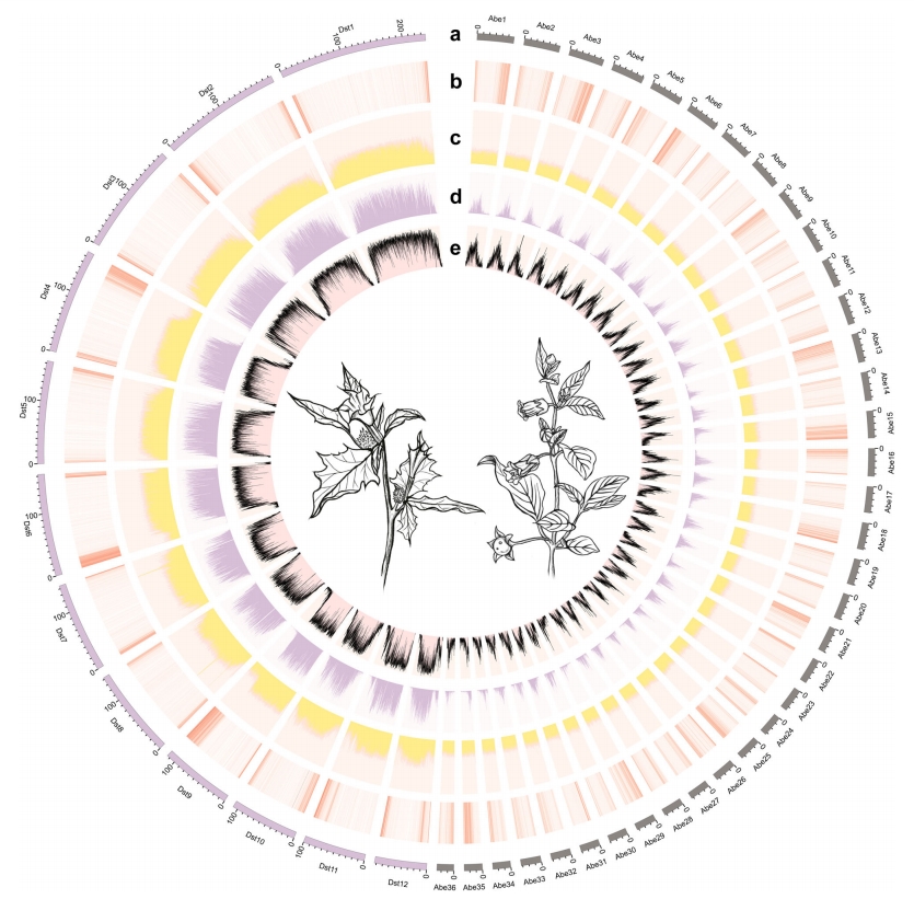 本研究基于三代PacBio、Nanopore、Hi-C等技術成功構建了2個具有代表性的產(chǎn)mTAs的物種:顛茄和曼陀羅染色體水平基因組。研究結果表明:它們在茄科中的親緣關系較遠,但這兩個物種產(chǎn)生mTAs的生物合成途徑是保守的。保守的基因簇和基因重復構成了TAs在該科中廣泛分布的基礎,導致mTAs的分支基因可能在茄科早期祖先物種中進化,但在大多數(shù)譜系中都已丟失,顏茄和曼陀羅是例外。此外,研究還鑒定了一種細胞色素P450,它能將莨若堿修飾成去甲莨菪堿。此研究結果為了解茄科植物中TAs的生物合成提供了基因組學基礎,并將有助于通過合成生物學方法進行mTAs的生物技術生產(chǎn)。