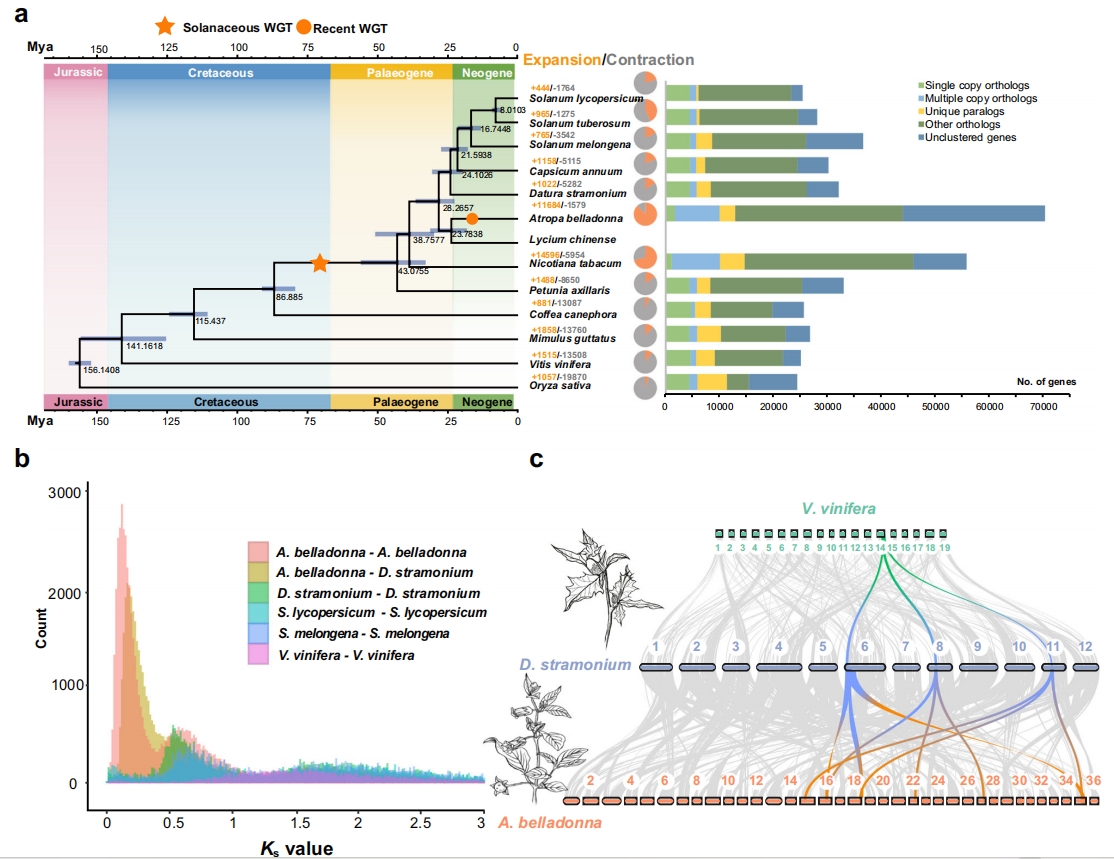 作者利用顛茄和曼陀羅,以及8個茄科物種和4種其他被子植物的207個單拷貝基因進行系統(tǒng)發(fā)育分析。結果表明:顛茄和枸杞屬于一個分支,而曼陀羅、辣椒、茄子、番茄和馬鈴薯屬于另一個分支,估計矮牽牛在約43Mya(33-56Mya)從茄科物種分化而來,曼陀羅在約28Mya(23-37Mya)由順茄和枸杞組成的分支分化而來,而顛茄在大約24Mya(18-31Mya)從枸杞分化而來。Ks分析顯示,茄科物種與其他高等雙子葉植物共享較古老的伽馬古多倍體事件。對顛茄、曼陀羅和葡萄進行基因組共線性分析,對于葡萄基因組的各個區(qū)域,通常在曼陀羅基因組中能鑒定出3個與之匹配的區(qū)域,并且在顛茄和曼陀羅之間也有相似的現(xiàn)象。