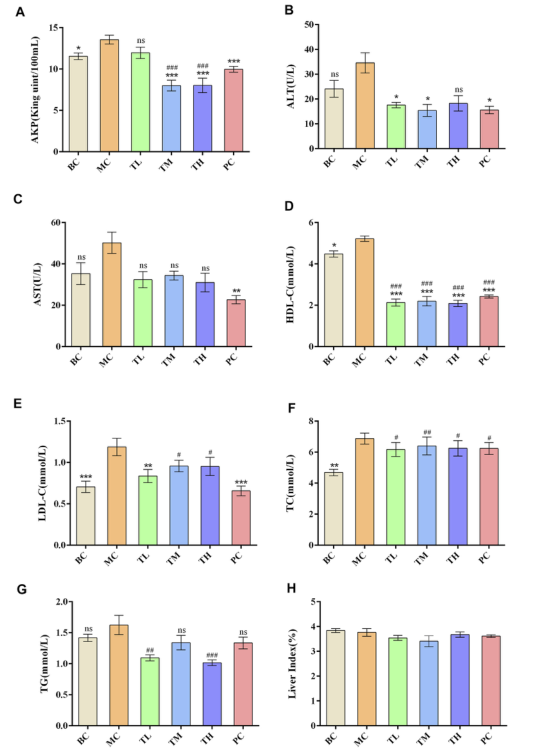 TM組和TH組降低AKP效果優(yōu)于TL組,TG組降低AKP效果優(yōu)于TM組。PC組降低AKP的效果優(yōu)于TL組,但差于TM組和TH組。PC組降低低密度脂蛋白膽固醇的效果優(yōu)于TM組和TH組,表明高脂飼料可導(dǎo)致大鼠血脂和肝酶代謝異常,高脂高脂顆粒可改善高脂大鼠血脂代謝和肝酶活性。與陽性藥物相比,HRG在改善高密度脂蛋白膽固醇、甘油三酯、堿性磷酸酶方面具有優(yōu)勢(shì),且改善程度可能呈劑量依賴性。各組間器官指數(shù)無顯著差異,HRG對(duì)小鼠生化指標(biāo)和器官指數(shù)的影響如圖2所示。