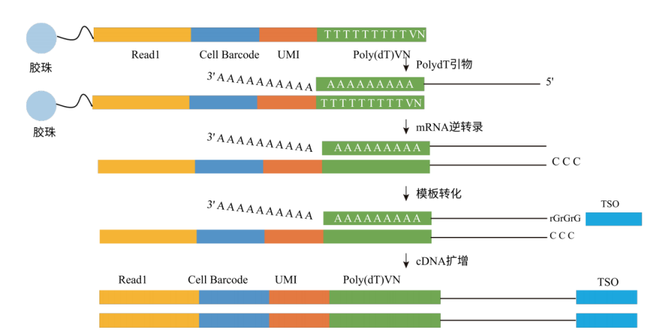 GEMs形成后,細胞裂解釋放出mRNA;同時膠珠也會自動溶解,釋放出大量含有Barcode序列的引物,并利用引物末端的Ploy(dT)VN序列捕獲液滴中的mRNA,并在一個個GEM中獨立完成mRNA逆轉錄,產(chǎn)生帶有Barcode和UMI信息的cDNA。隨后“油包水”結構裂開,進行cDNA擴增。