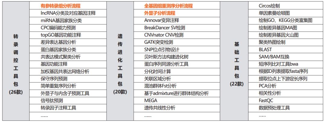 2)軟件:根據(jù)用戶需求我們提供了常用生信軟件,并封裝和串聯(lián)成常用分析模塊,通過單行命令即可完成很多常規(guī)分析內(nèi)容,如基因表達(dá)量計(jì)算、突變檢測(cè)、基因功能注釋等。