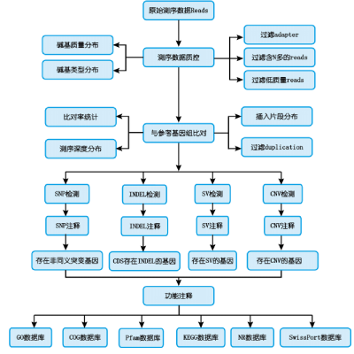 全基因組重測序(whole genome sequencing,WGS)對全基因組進行測序掃描,能在全基因組范圍之內(nèi)解讀所有常見和稀有變異信息,全面檢測單核苷酸多態(tài)位點(Single Nucleotide Polymorphisms, SNP)、插入缺失位點(Insertion Deletion, InDel)、結構變異(Structure Variation,SV)以及拷貝數(shù)變異(Copy Number Variation, CNV)。