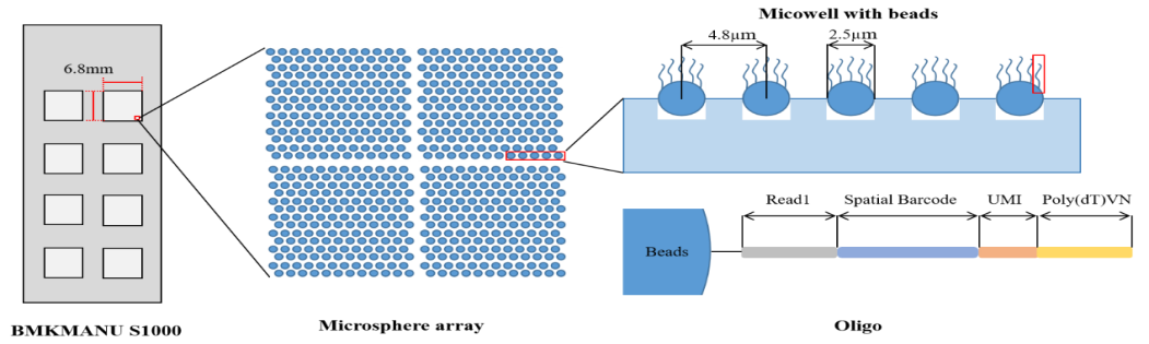 在6.8mm * 6.8mm的捕獲區(qū)域內(nèi)有約220萬(wàn)個(gè)直徑2.5μm的微孔,將布滿(mǎn)oligo(R1+Spatial Barcode+UMI+poly(dT)VN)直徑2.5μm的微球隨機(jī)嵌入到微孔之中,形成陣列,相鄰兩個(gè)微珠的中心距離為4.8μm。Spatial barcode 種類(lèi)有為5600萬(wàn)種,提供了更為長(zhǎng)的sptail barcode長(zhǎng)度,約為70bp,這能更好的兼容三代測(cè)序,能大幅提高nanopore數(shù)據(jù)的BC識(shí)別效率。